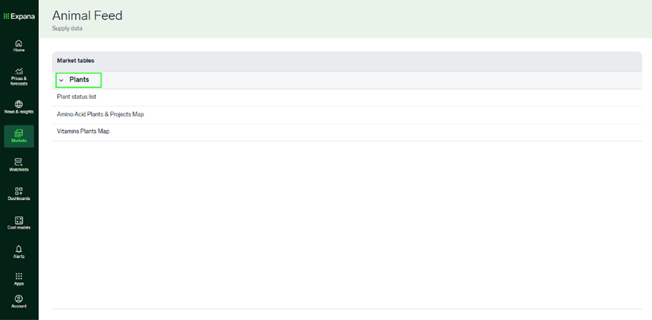 In Expana platform this information can be found under Markets > Animal Feed. You’ll see information presented as a list with collapsible sections, and can click into e.g. Plants > Plant status list to find the same information as is available in FeedInfo platform.