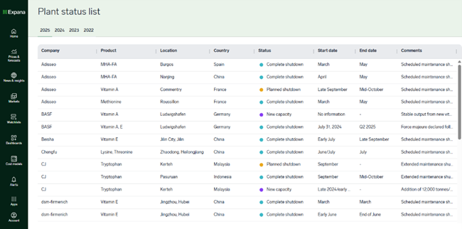 In Expana platform this information can be found under Markets > Animal Feed. You’ll see information presented as a list with collapsible sections, and can click into e.g. Plants > Amino Acid Plants & Projects Map to find the same information as is available in FeedInfo platform.
