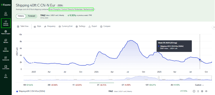 In Expana platform this information can be found under Prices & forecasts. for example if you’re looking for a major route like Shanghai – Rotterdam (see image for FeedInfo view)