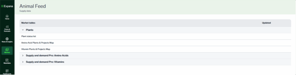 In Expana platform this information can be found under Markets > Animal Feed. You’ll see information presented as a list with collapsible sections, and can click into e.g. Plants > Amino Acid Plants & Projects Map to find the same information as is available in FeedInfo platform.