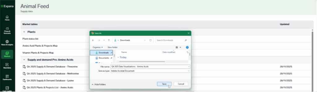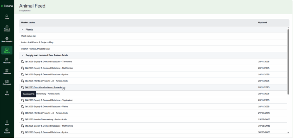 - Visit Markets > Animal Feed and see all files available under either Supply and demand Pro: Amino Acids or Supply and demand Pro: Vitamins