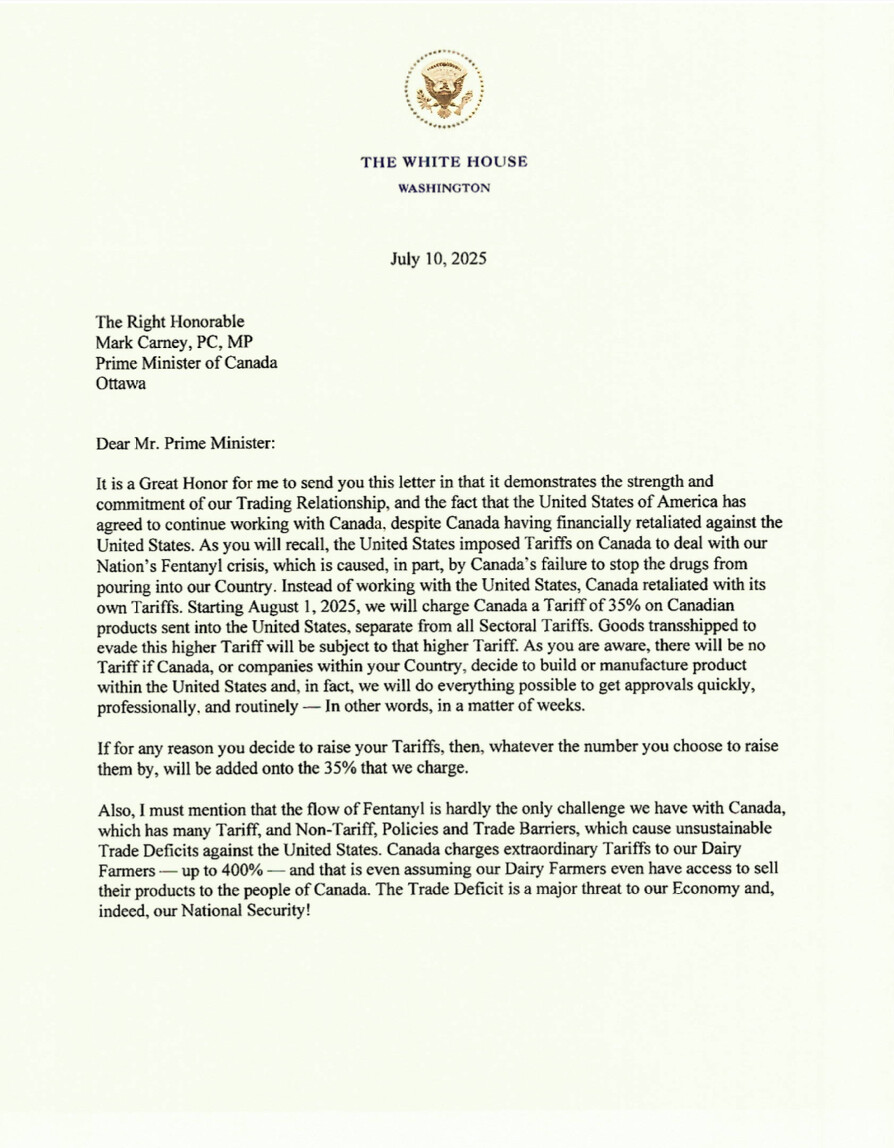 Here’s the letter Trump sent to Carney later in the evening on July 10:
