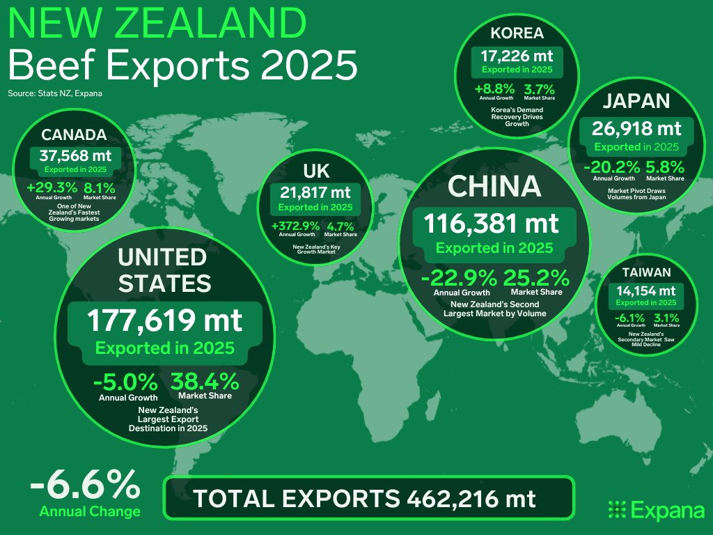 Marking a seven-year low, New Zealand’s 2025 total beef exports (customer access only) fell to the lowest level since 2018.