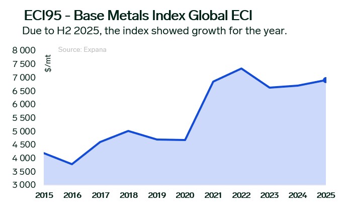 2025 was a year of price rises across base metals. The Base Metals Global Expana Category Index (ECI), based on London Metal Exchange (LME) prices, rose 3% year-on-year on average for the year (except for complete data for December 2025). The main constraining factor for the index was a 10% decline in nickel prices, continuing a trend seen since 2023 amid persistent global market surplus. Lead prices have also trended downward since 2022, and were down 5% in 2025 due to deteriorating consumption prospects, especially in automotive batteries. Zinc prices decreased marginally due to weak demand, primarily in construction. Substantial price growth was shown by metals used in electronics and energy infrastructure development. Main growth drivers were copper and aluminum, which rose 6% and 6.5% respectively in 2025, maintaining an unstable but overall rising price trend since 2017. Tin showed the highest price growth of 11% in 2025, amid strong demand for refined tin and raw material supply shortages.