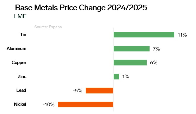 Zinc experienced supply compression mid-year amid reduced mining at several major mines, leading to temporary inventory declines. However, weak construction activity, primarily in China, limited demand growth at year-end.