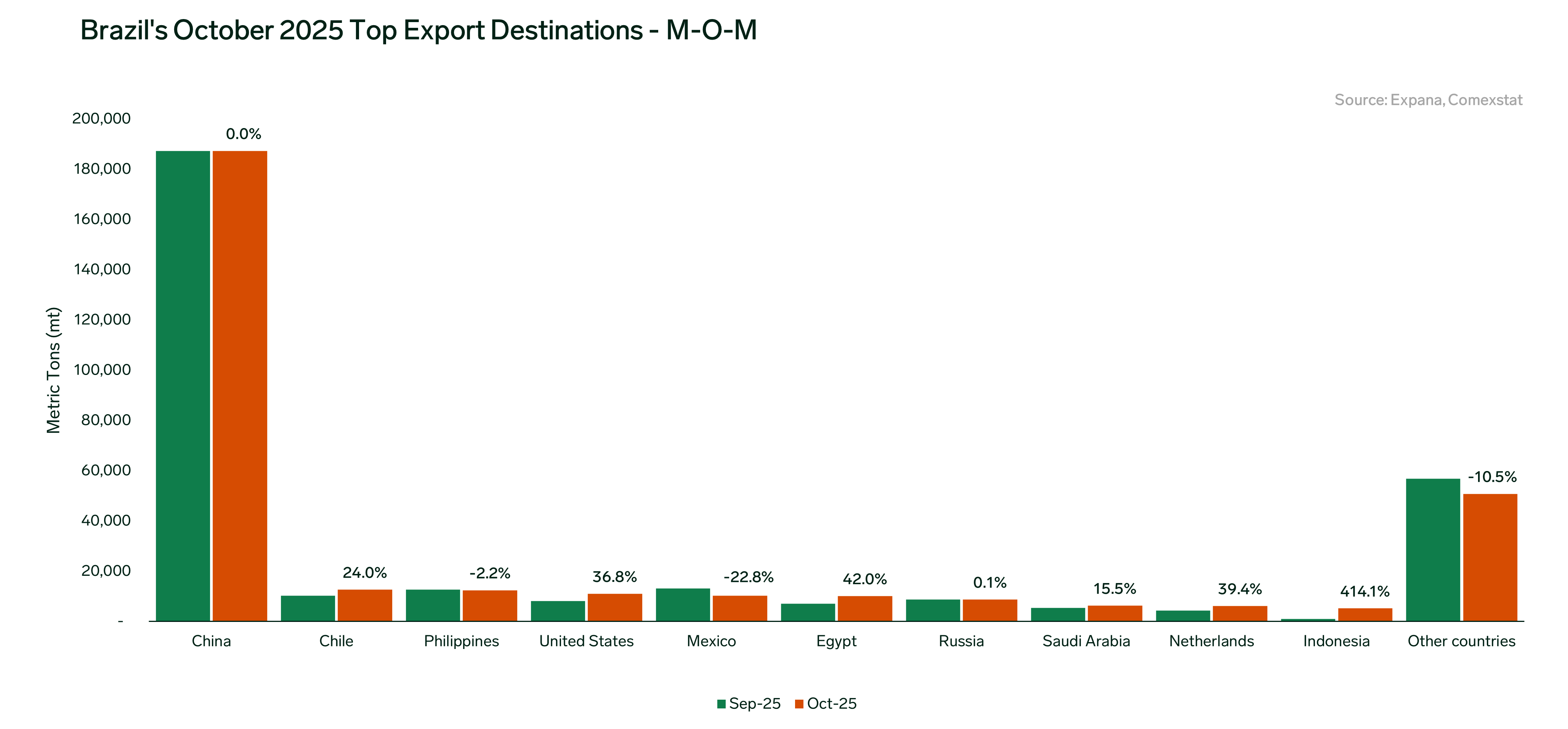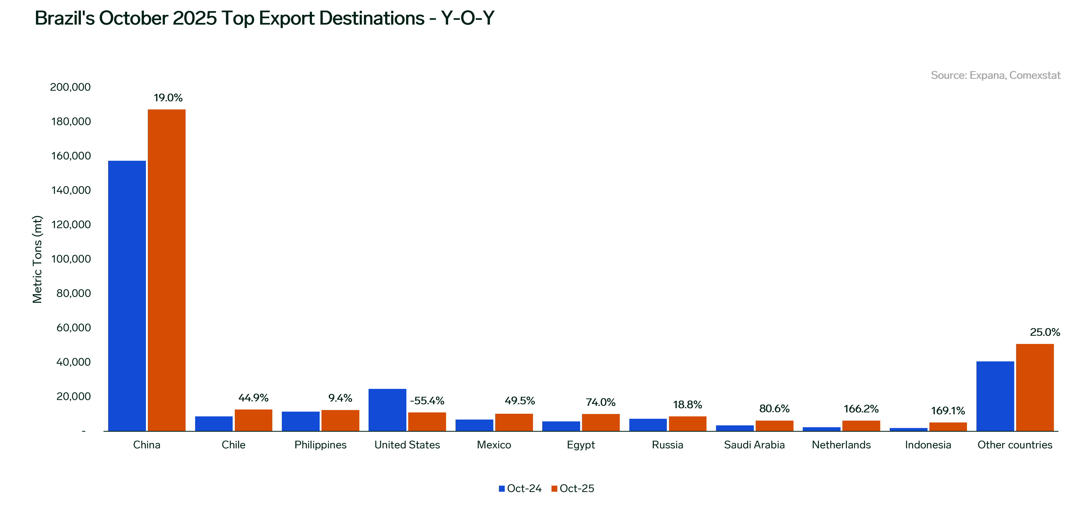 Mexico followed next in fifth place at 10,172 mt, reflecting a 22.8% monthly decline as buyers held back on forward purchases while closely monitoring the expected renewal of the Package Against Inflation and Scarcity (PACIC) by the end of the year. Despite the monthly drop, exports to Mexico remained 49.5% higher YOY.