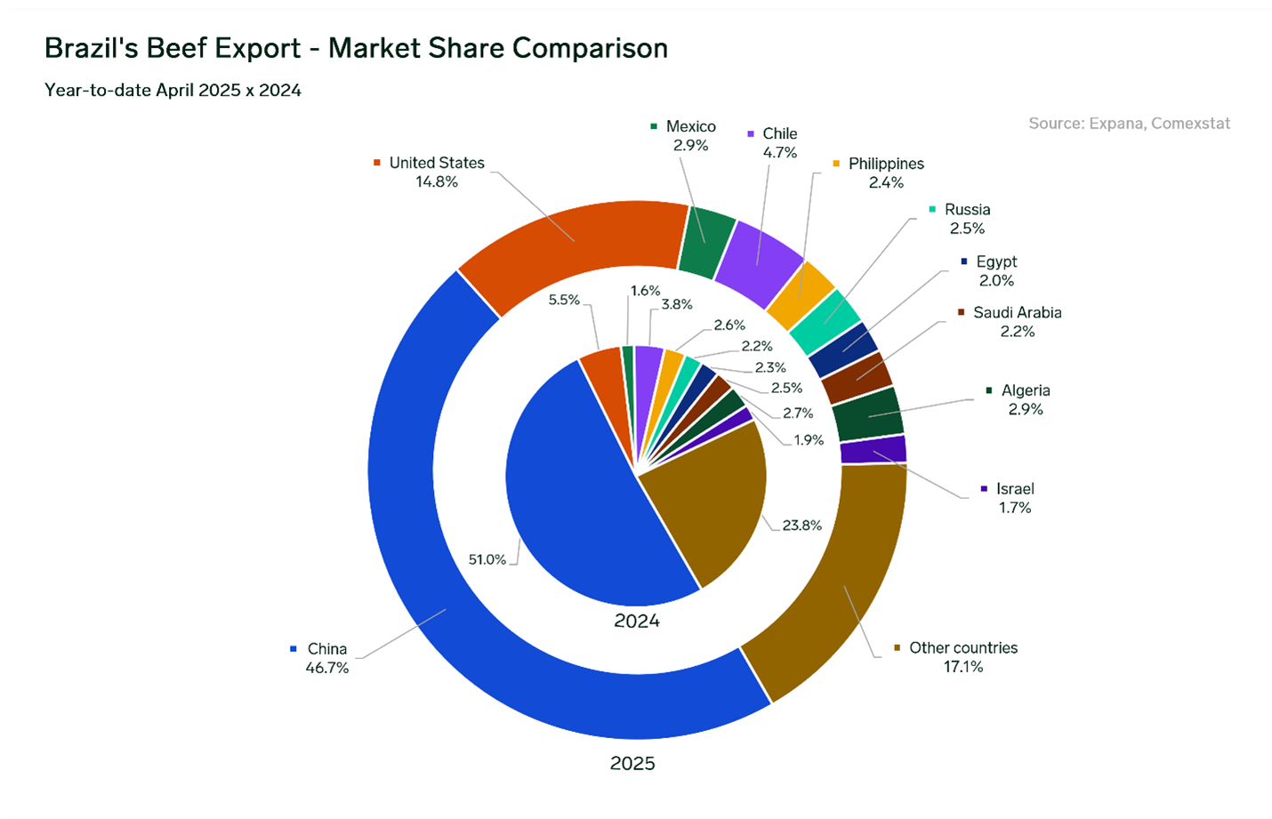 However, the greater opportunity lies in Northeast Asian countries, such as Japan and South Korea, world’s third and fourth largest beef importers, respectively. Both markets are known for their preferences for high-valued beef options, maintaining stringent import restrictions on beef, particularly affecting the premium segment. In 2024, Japan imported 527,639 mt of beef, with nearly half sourced from Australia and over a third from the United States. Japan YTD imports in the first four months of 2025 dropped 17.0% YoY to 146,040 mt amid fragile macroeconomic situation, high living costs and a weakened yen. Nonetheless, some believe that this challenging scenario poses an opportunity for Brazilian beef to enter this market as a cheaper option to the Japanese consumers who still keep beef in their eating habits.