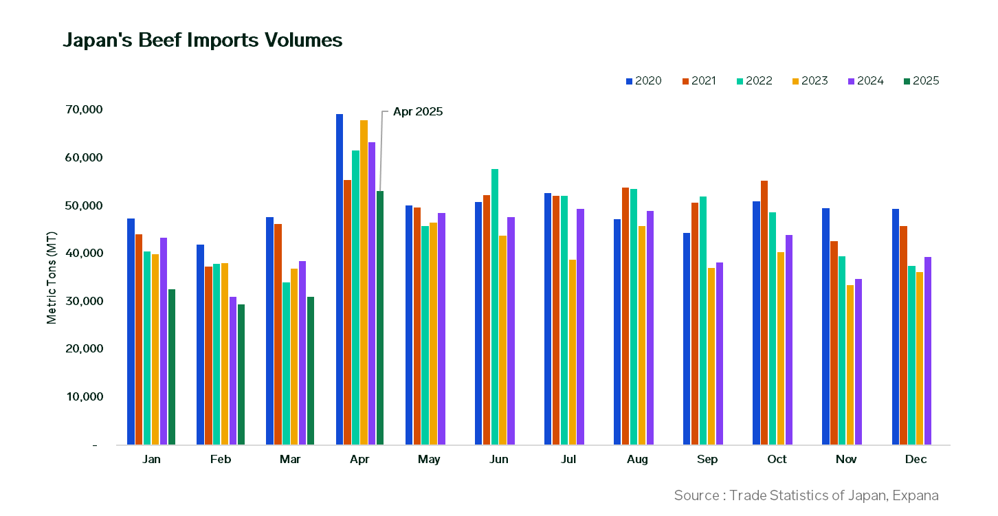 In the case of South Korea, the beef import market remains highly concentrated. The United States and Australia dominated supply in 2024, accounting for 48.1% (221,628 mt) and 44.6% (205,403 mt) of total imports, respectively. While the country faced subdued beef demand last year due to weak consumer spending and currency-related cost pressures, recent data suggest a modest recovery. In the first four months of 2025, cumulative imports rose 2.5% YoY to 180,083 mt, signaling an early improvement in trade dynamics and potentially opening a window for new suppliers.