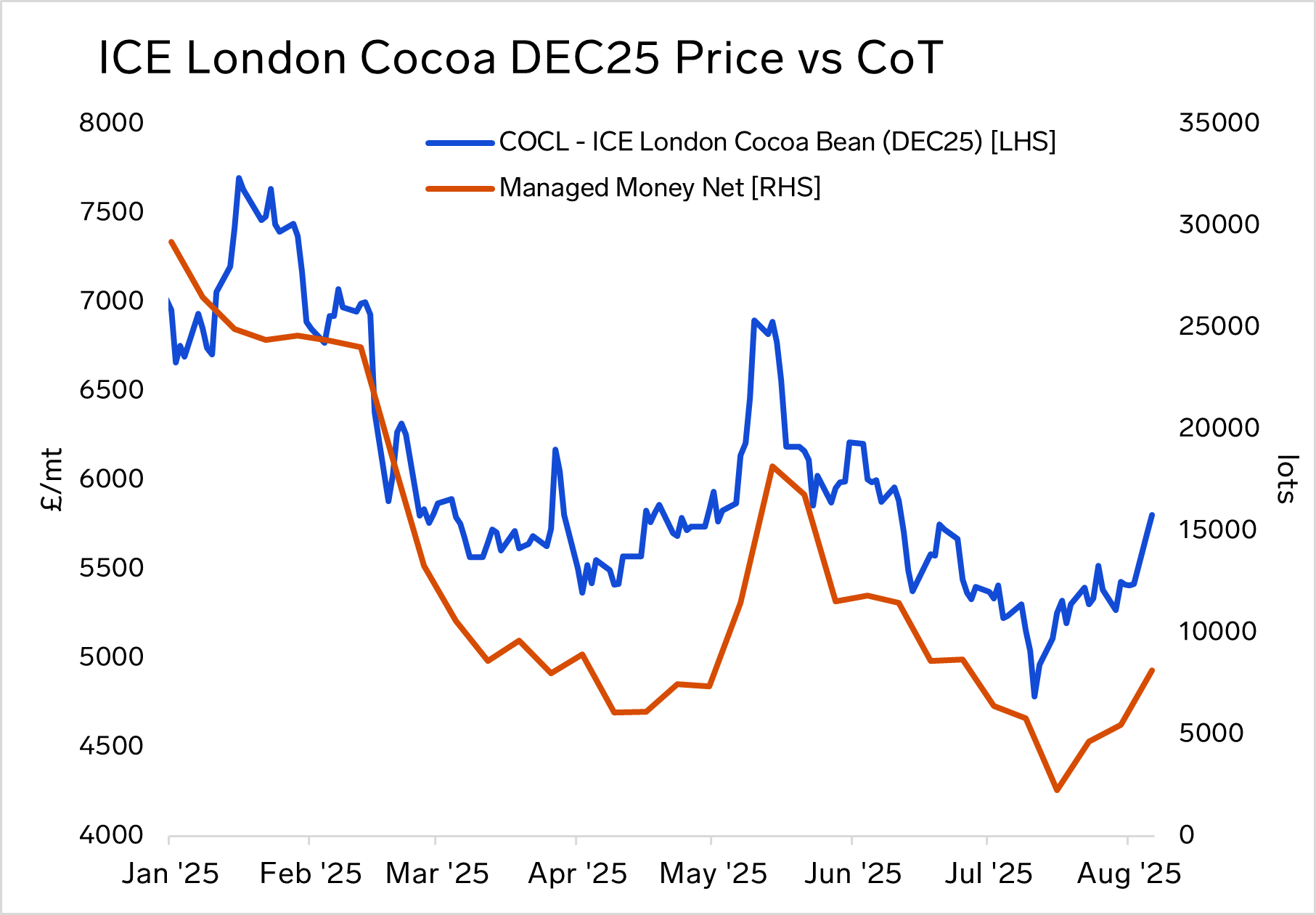 Expana crop surveys in Ghana point to additional challenges. Pod set is at its weakest for this point in the season since 1999. Although pod survival remains in line with normal seasonal patterns, overall pod load has dropped to 91% of the ten-year average, down from 100% three weeks earlier. Price action on the ICE London futures exchange moved sharply higher last week, with the December 2025 contract briefly rallying to £5,800/mt last week before losing some momentum. The contract closed at £5,551/mt on August 15 and has made few additional gains today as of the time of publication. News of the dry weather concerns last week saw speculative buying increase, with funds increasing their net long position by nearly 3,000 lots week-on-week as of the most recent report, which was met with producer selling. Traders report that hedging flows and a lack of speculative follow-through have kept the market capped below £5,900, even as supply risks mount.