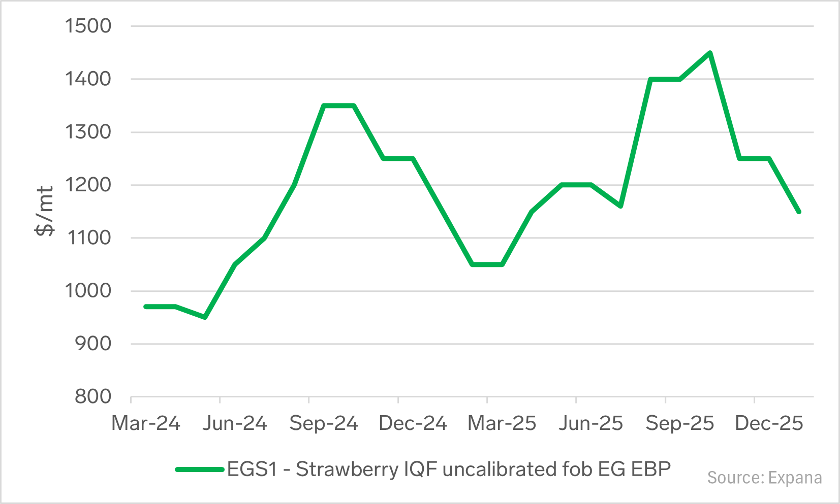 With the new strawberry season starting in November/December 2025, the successful harvest and ample supply have weighed on prices. Expana Benchmark Prices (EBP) for Strawberry IQF Uncalibrated FOB Egypt dropped by 8% m-o-m on January 30, to $1,150/mt.