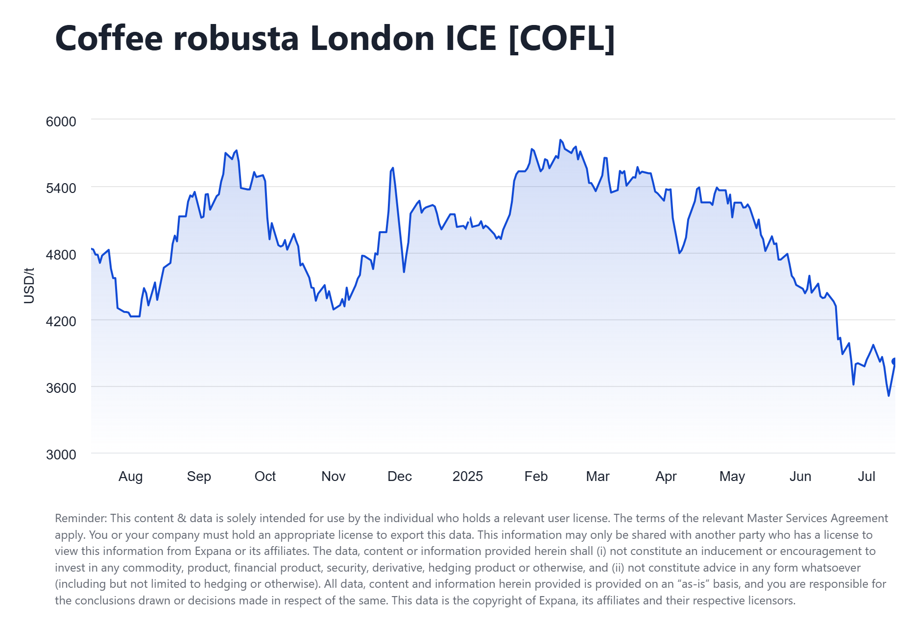 Prices are also falling for robusta—even as main producers like Vietnam, Indonesia, and Brazil all face tariff hikes, reported Expana. On July 14, nearby robusta contracts closed at $3,821/MT, according to Expana. Just a week prior, the contract hit the lowest price since Spring 2024.