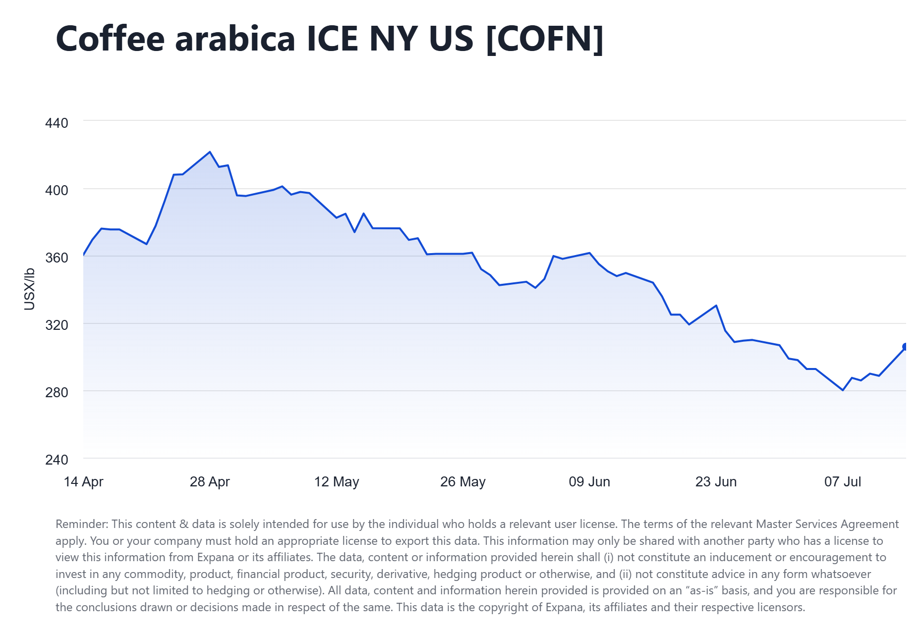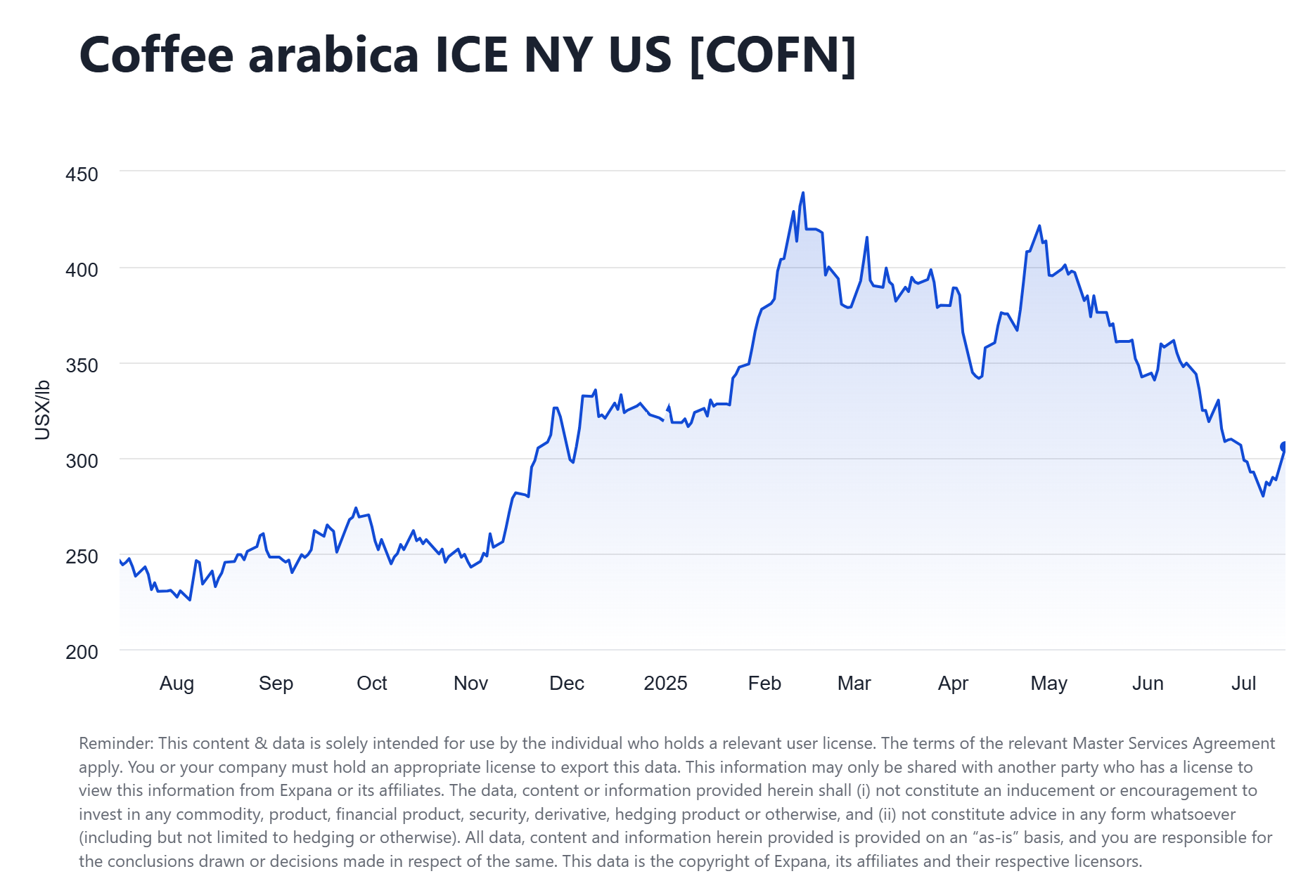 With global supply looking up, coffee prices have fallen from record highs. On July 14, nearby arabica contracts on NY ICE closed at 305.70 USc/LB (or $6,739 /MT), according to the Expana platform that showed a price bounce due to US-Brazil tariff uncertainty.