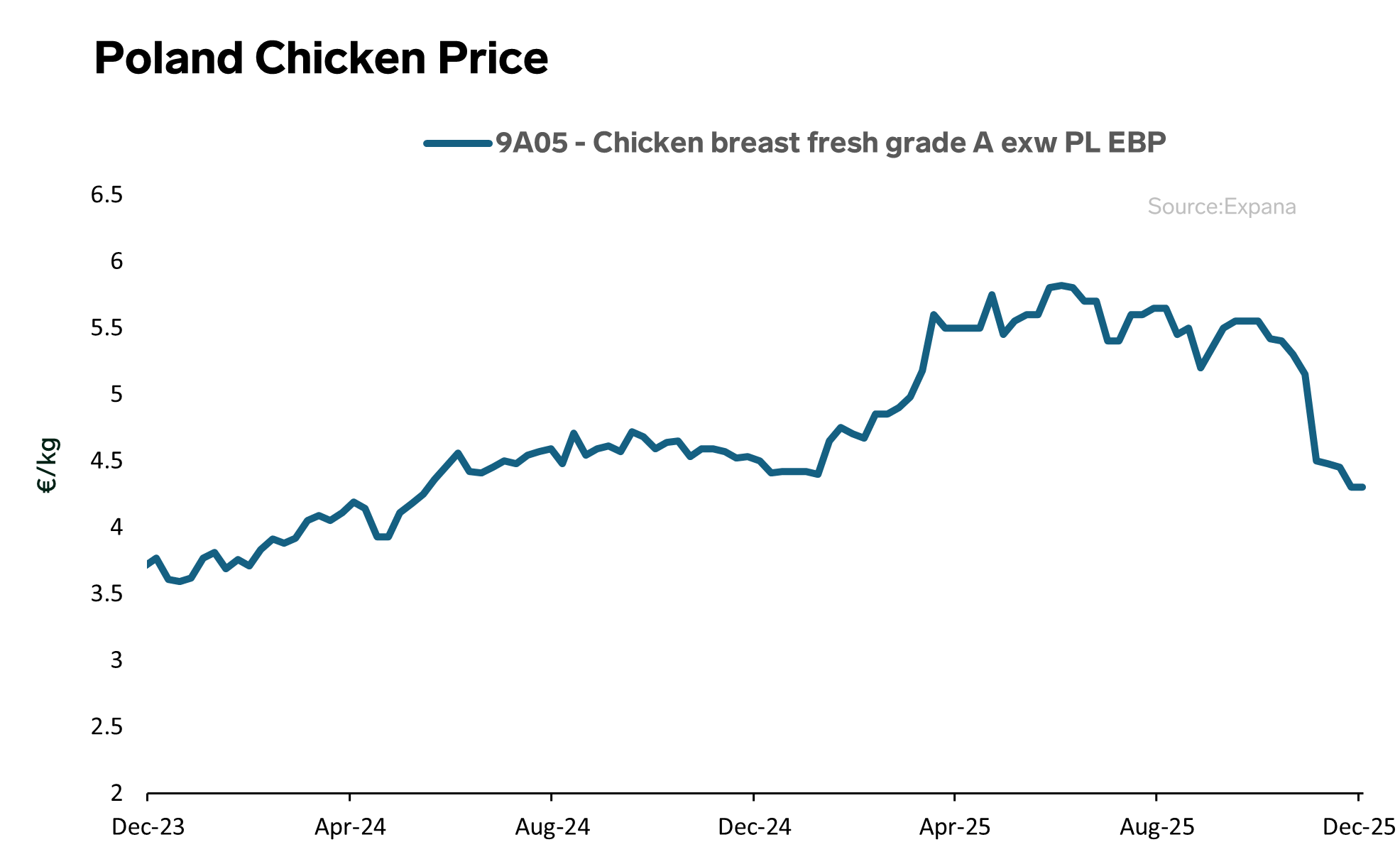 Poultry meat prices across Europe have already come under pressure as farmers accelerated slaughtering schedules in response to avian influenza risks. Market participants suggest that Hong Kong’s import suspensions could further increase domestic supply within Europe, exacerbating the current downward price trend. Reflecting this sentiment, the Expana Benchmark Price for chicken breast in Poland fell by 8.99% month-over-month (m-o-m) and 8.37% year-over-year (y-o-y) to €4.05/kg in the week ending December 17.