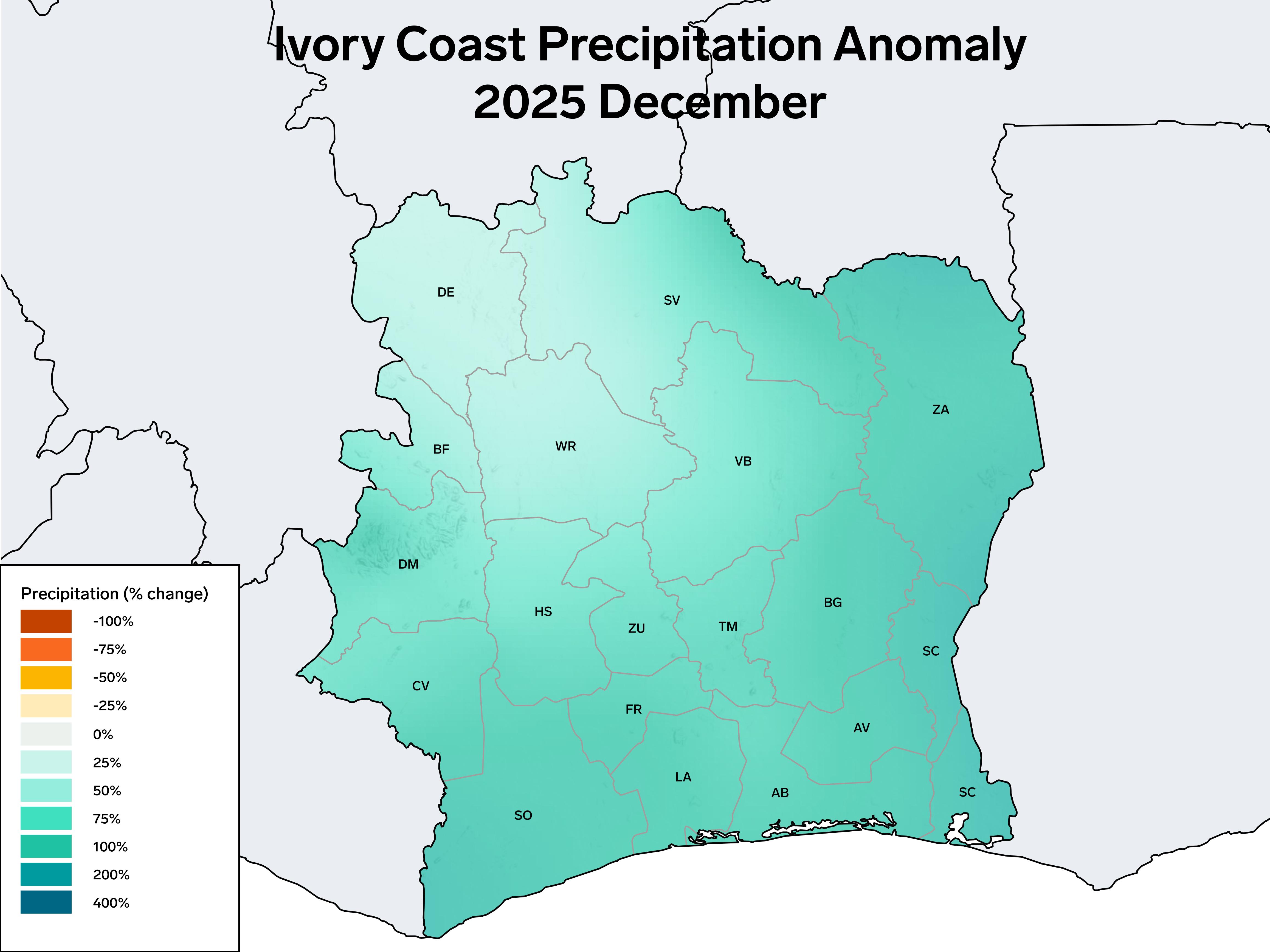 Figure 1. Ivory Coast’s 2025 December precipitation percentage change compared to the 30-year average. Source: Expana and the Weather Company.