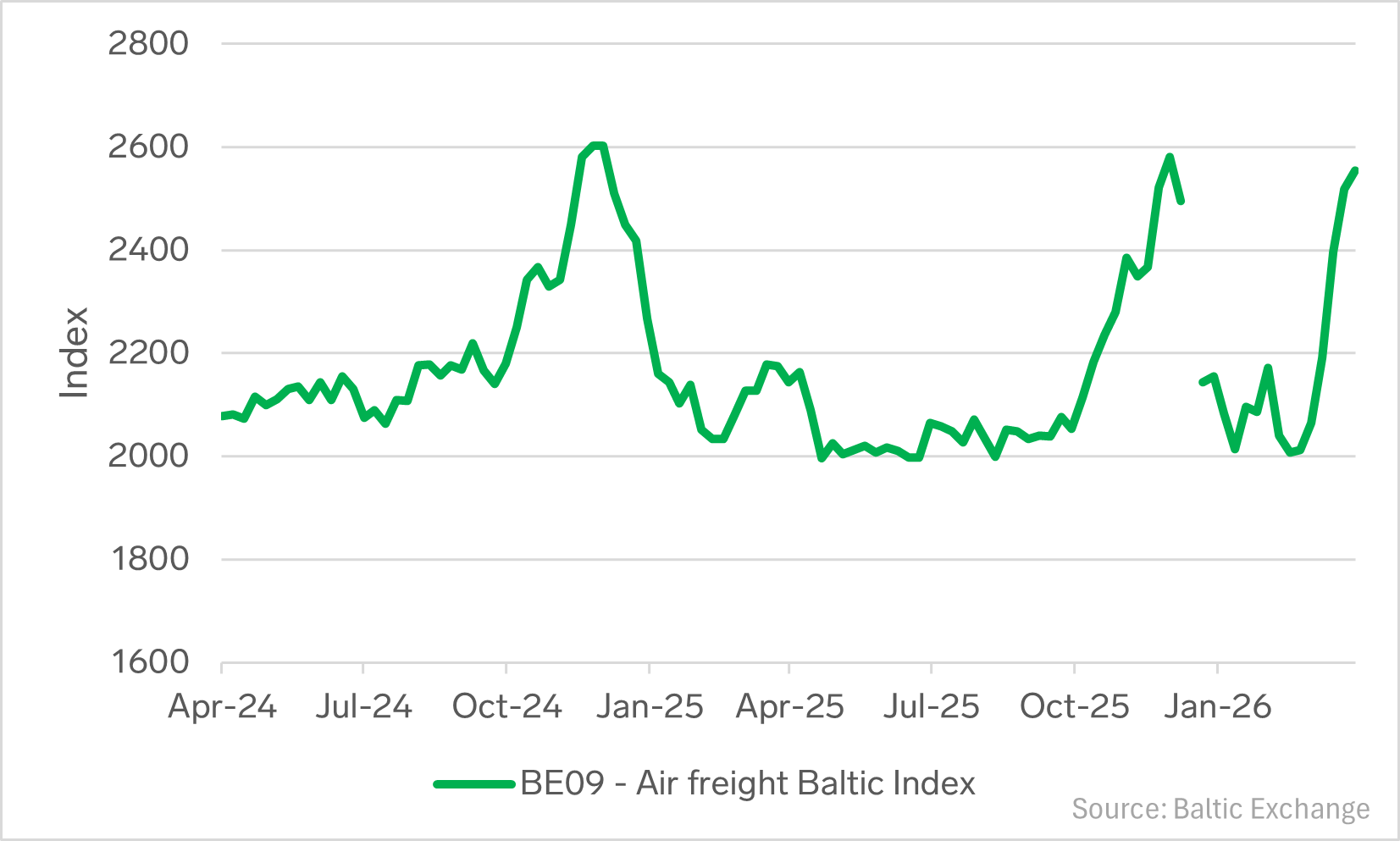 As a result of the turmoil, air freight rates increased significantly over March, and as of April 8 (latest data), the Air Freight Baltic Index stood at 2,519, up by 25.2% month-over-month and 15.8% YOY.
