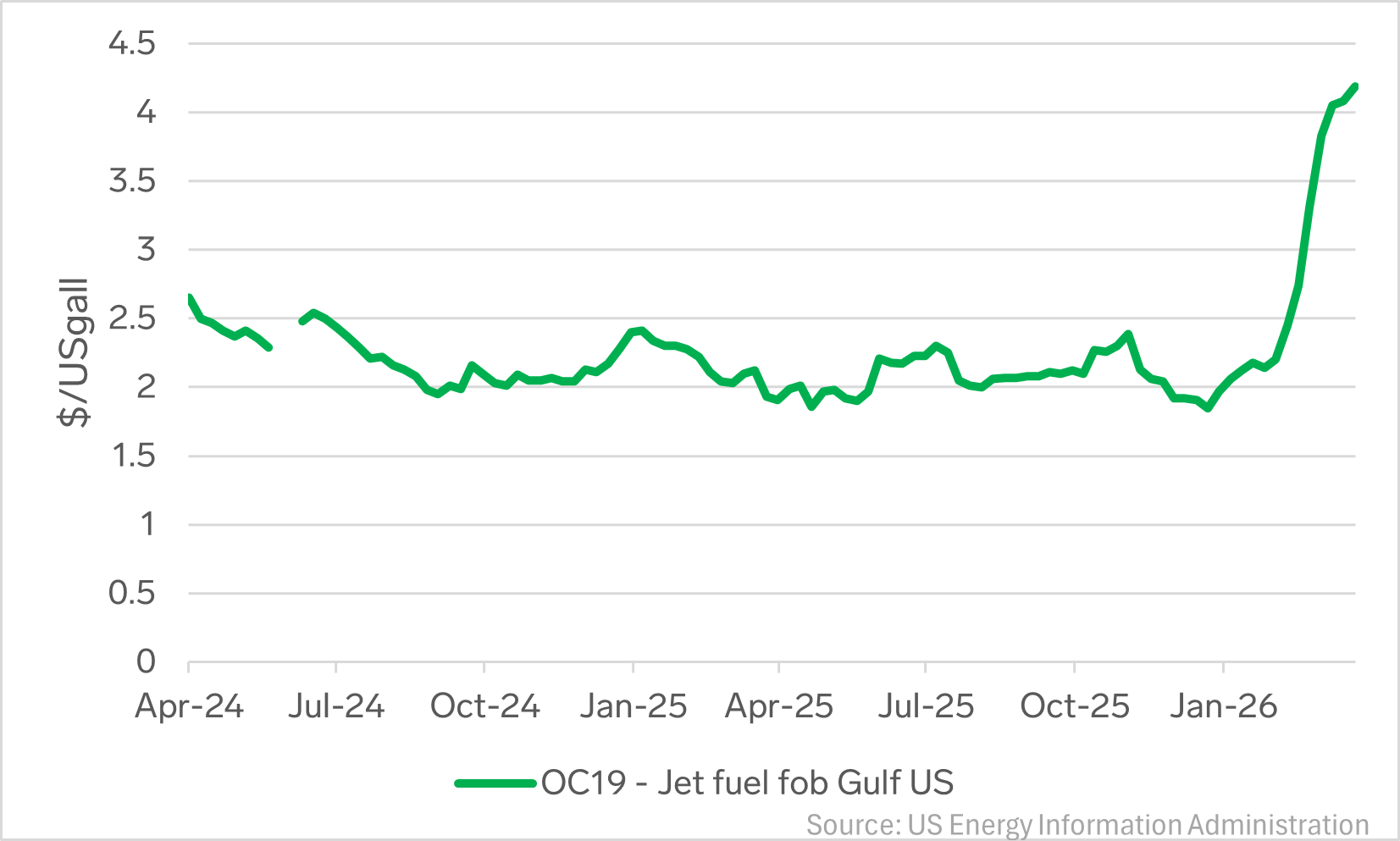 In addition, the effective closure of the Strait of Hormuz, a key transit corridor for about 20% of global oil supply, drove the price of Brent crude from about $72/barrel before the outbreak of the war to about $118/barrel at the end of March. Jet fuel prices recorded even greater increases. On April 8 (latest data), prices for Jet fuel, kerosene-based, FOB US Gulf Coast stood at $4.19/gallon, down slightly from the March peak of $4.45/gallon, but still up by 126% quarter-over-quarter and 117% year-over-year (YOY).