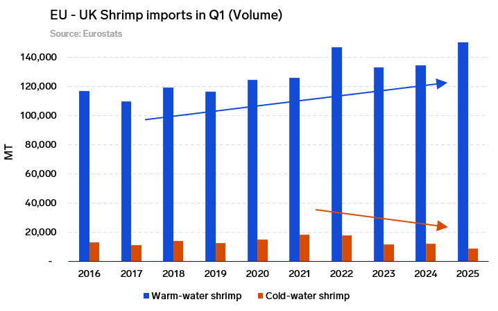 The overall growth in shrimp consumption across Europe is primarily attributed to increased demand for warm-water shrimp. A review of Q1 data over the past decade indicates a rather consistent upward trend in warm-water shrimp imports since 2017, whereas cold-water shrimp volumes have declined over the past four years. This shift reflects global production dynamics, particularly Ecuador’s strategic push to expand its presence in key markets such as China, the U.S., and Europe. Market sources also note that the wild cold-water species (Pandalus borealis) faces stiff competition from farmed vannamei shrimp, especially in the UK market, further contributing to the segment’s mild decline.