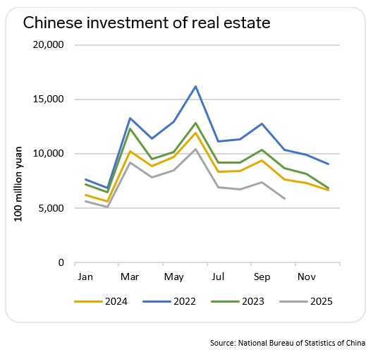 The construction sector remains in deep decline. Real estate investment fell 15% Y-O-Y for the first ten months of 2025, with October showing a 23% drop, the steepest since December 2023. Trade conflicts and policy uncertainty worsen conditions for investors, sharply reducing construction activity. Construction is a key sector for steel consumption in China, so a decline in investment is directly reflected in a drop in construction volumes and, as a result, a decline in steel consumption.