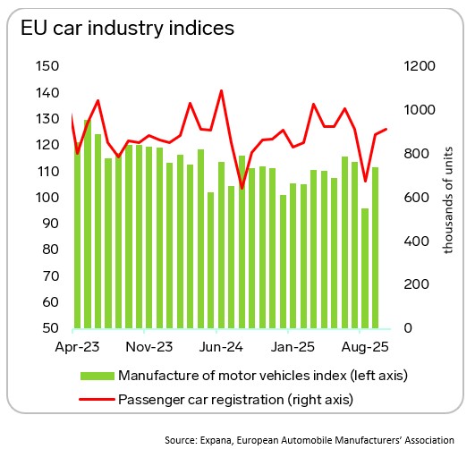 Automotive production remains weak. September showed 0.4% Y-O-Y growth, but this did not compensate for previous losses. Total output declined 3.2% Y-O-Y for the first nine months of 2025. New car registrations grew 1.3% Y-O-Y for the first nine months, reflecting rising imports. Parts suppliers report declining orders, providing no basis for rapid recovery.