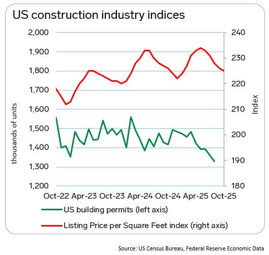 The housing market in the US shows only limited improvement. Existing home sales rose 1.5% month-over-month (M-O-M) and 4.1% Y-O-Y in September. Mortgage rates falling to 6.2% in October improved demand conditions, but activity concentrates in expensive segments. Housing inventory is growing and demand is selective, creating price pressure.