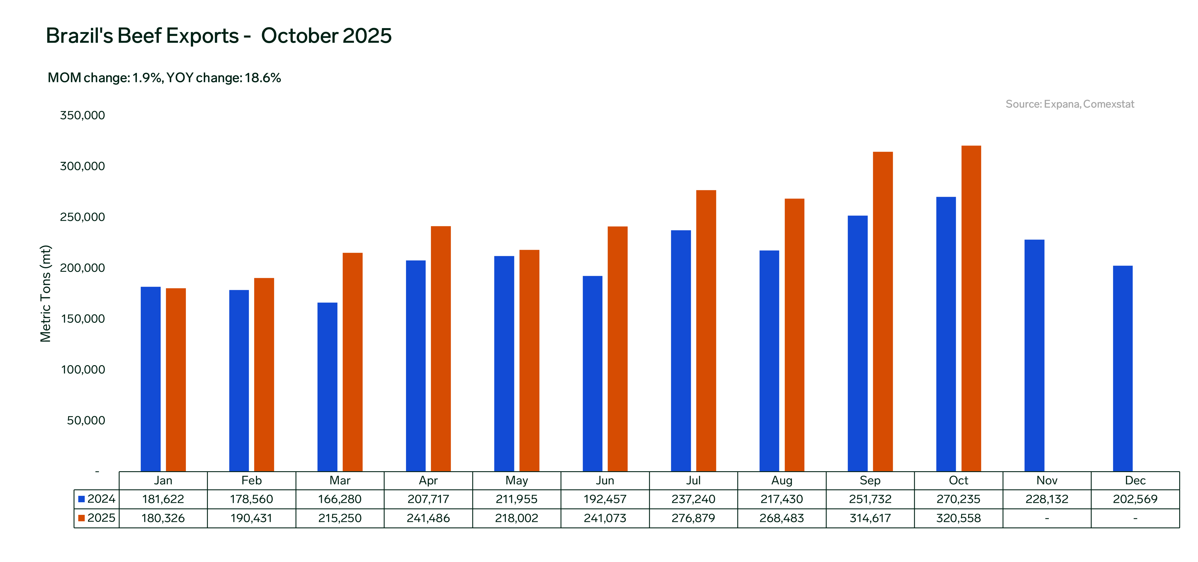 Despite that, overall beef shipments increased notably throughout 2025, with China being the key driver. Markets like Mexico, Chile, Egypt and other countries also grew significantly, which helped to narrow the gap created by weaker US volumes. Only this year, Brazil registered record fresh beef export levels three times, in July, September and October.