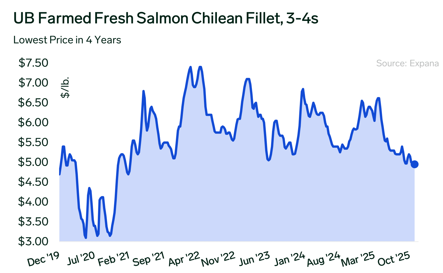 With the calendar into December, industry participants often expect a seasonal bump heading into the holiday period, when salmon typically performs well at both retail and foodservice. Thus far, the anticipated December lift has not yet materialized in the spot marketplace. This delay is not without precedent, in 2024, prices did not begin to move upward until mid-month. Currently, quotations for fresh 3-4 pound Chilean fillets are sitting below the $5.00 per pound mark on the low end, heightening a sense of uncertainty and prompting many buyers to wait for signs of seasonal strength.